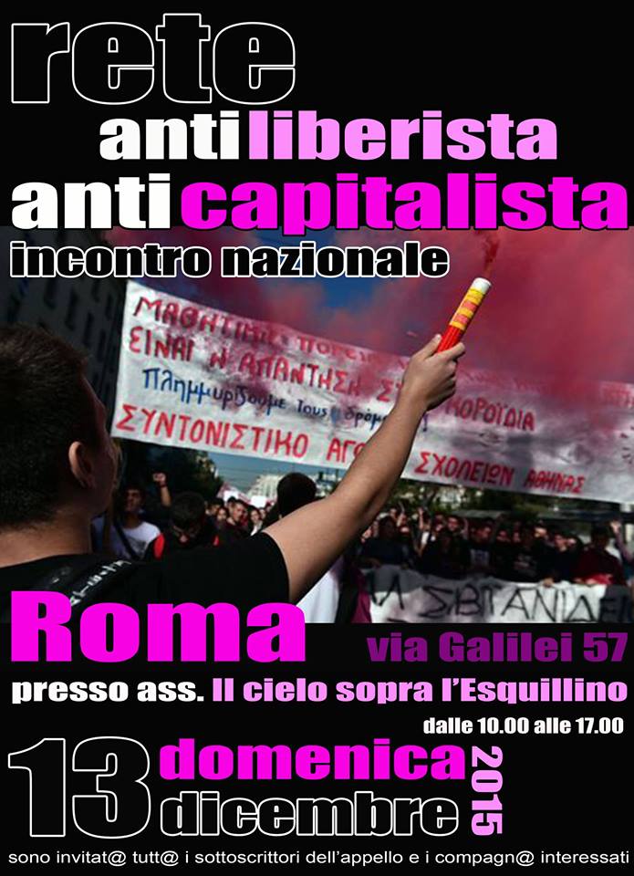 Il primo incontro nazionale della Rete Antiliberista e Anticapitalista si terrà a Roma, domenica 13 dicembre dalle ore 10 alle ore 17, presso Via Galilei, 57 c/o la sala “Il cielo sopra l’Esquilino” (metro A – Manzoni).