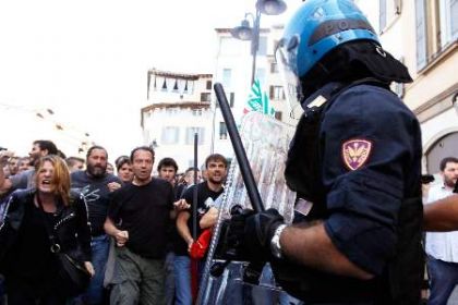 Come da copione, la prima carica si scatenò a freddo, durante il percorso. Le manganellate mi piombarono sul collo e sulla schiena mentre coprivo, col mio corpo, una compagna. Dopo, all’imbocco della piazza, le transenne corazzate di poliziotti e di carabinieri in assetto antisommossa, per impedire al corteo di entrare.