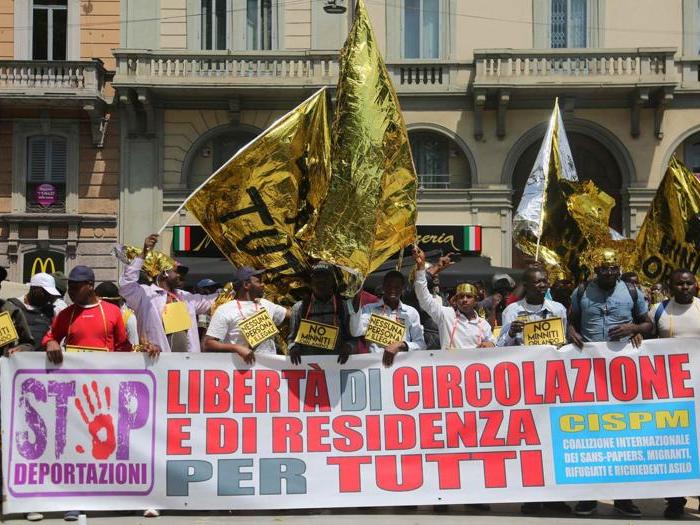 Sparse per tutto il corteo, legate in vita o in testa per proteggersi dal sole intenso, le coperte termiche oro e argento che la rete “Nessuna persona è illegale” ha scelto come simbolo della sua presenza, per un vero diritto all’accoglienza e contro tutte le leggi securitarie e razziste in materia di immigrazione, dalla Bossi-Fini alla Minniti-Orlando.