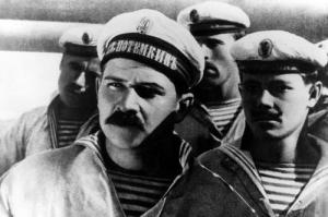La grande bandiera tutta pulita di rosso, al posto di quella zarista da guerra. La nave senza più ufficiali e ordini; guidata dalle mani, dai cuori, dalla solidarietà dei marinai liberati per scelta determinata. I compagni delle altre navi che non li colpiscono, ma li salutano e urlano i loro “urrà” e ci provano a seguirli.