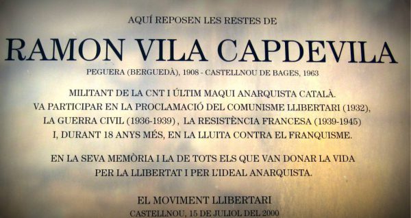 «Qui giacciono i resti di Ramon Vila Capdevila. Militante della CNT e l’ultimo degli anarchici catalani del maquis, prese parte alla proclamazione del comunismo libertario (1932), alla guerra civile (1936-39), e alla Resistenza francese (1939-45) e, per altri 18 anni, alla lotta contro il franchismo. In memoria di lui e di tutti coloro che hanno dato la vita per la libertà e per l’ideale anarchico».