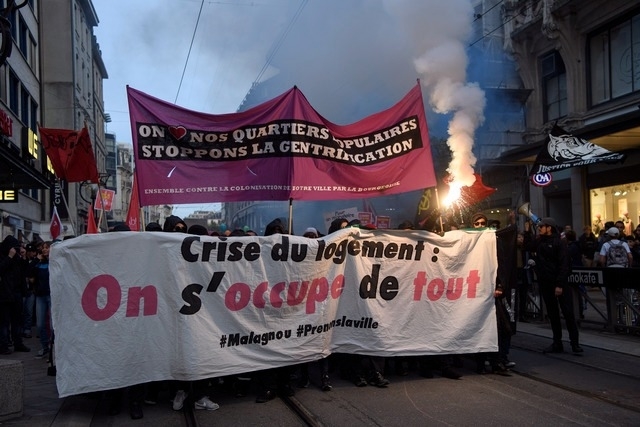 Trovare un alloggio a Ginevra è estremamente difficile. Migliaia le persone che cercano, poche le stanze o gli appartamenti disponibili; trovarlo a prezzi accessibili, impresa ancora più ardua. Molti sono costretti a vivere nell’hinterland, senza comunque riuscire a risparmiare chissà quanto, e viaggiare per raggiungere il luogo di lavoro o studio, riducendo dunque il tempo libero a loro disposizione e aumentando significativamente stanchezza e stress. Le circa cinquanta organizzazioni politiche, sindacali e culturali che hanno manifestato per la città al grido di “Prenons la ville!” non hanno dubbi in merito: il responsabile dell’attuale crisi abitativa a Ginevra è il capitalismo che con i suoi grandi proprietari, veri e propri latifondisti urbani, studia a tavolino strategie di gentrificazione e fissa i prezzi di mercato degli affitti, non tenendo ovviamente conto delle esigenze reali della maggior parte della popolazione. Molti quartieri della città sono, in questo senso, sotto un vero e proprio attacco. È il caso, ad esempio, del quartiere storico Les Grottes che resiste fin dagli anni ’70 ai tentativi di demolizione dei suoi edifici, avendo la grande colpa di trovarsi nell’iper-centro e proprio dietro la stazione centrale e di non essere votato al servizio del capitale. Il progetto sarebbe di raderlo completamente al suolo e riedificare sulle sue macerie uffici e negozi di alto livello nonché edifici con appartamenti da fittare a prezzi elevatissimi.