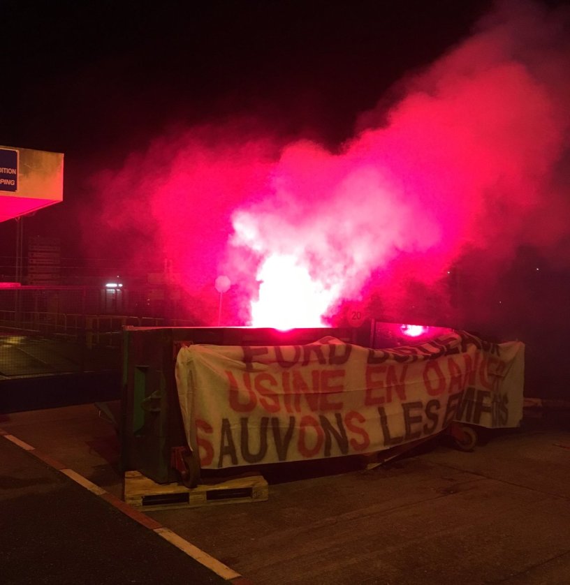 Usine Ford Blanquefort, ce matin, opération « barricades » pour La défense de l’usine et de tous les emplois, contre le départ de la multinationale. Avec les postiers et les étudiants en solidarité.
