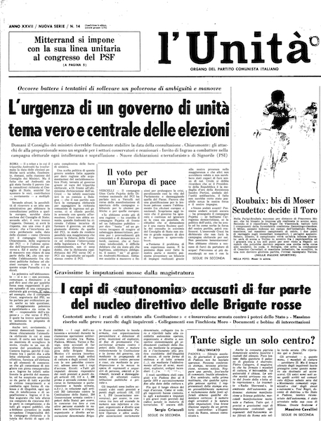 Il 7 aprile 1979 decine di militanti (che diventeranno centinaia nel corso dell’inchiesta) dell’area dell’Autonomia furono arrestati, in esecuzione di un duplice mandato di cattura emesso dai giudici Pietro Calogero e Achille Gallucci delle procure di Padova e Roma, con l’accusa di associazione sovversiva, banda armata e partecipazione a diciannove omicidi, fra i quali spiccava quello di Aldo Moro. L’accusa era di aver costituito una organizzazione segreta che dirigeva dietro le quinte ogni possibile formazione armata: come scriverà l’Unità due giorni dopo, «un unico filo, insomma, percorrerebbe tutte le formazioni terroristiche, dalla nebulosa del “terrorismo diffuso” alla perfezione militare delle Br. La mano che questo filo tira e manovra sarebbe quella dell’Autonomia», organizzazione nata dopo lo scioglimento di Potere Operaio e poi cresciuta nel corso degli anni Settanta, ovvero quella di Toni Negri, per il quale il giudice Calogero ricorre, prima volta nella storia dell’Italia repubblicana all’articolo 284 del codice penale «per aver promosso una insurrezione armata contro i poteri dello Stato e commesso fatti diretti a suscitare la guerra civile nel territorio dello Stato».
