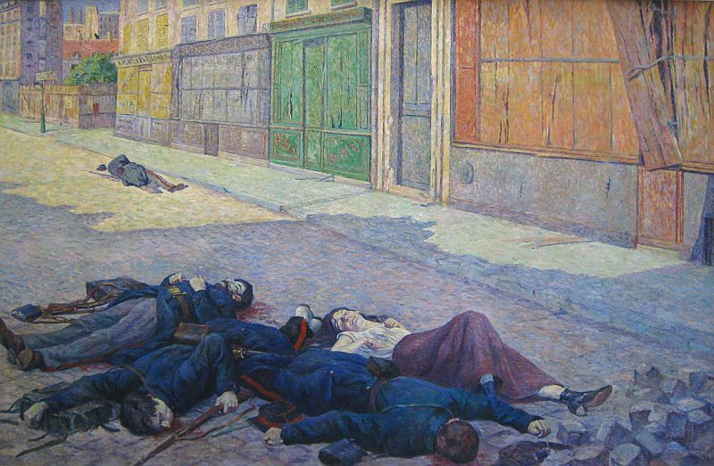 - in alto, olio su tela, Maximilien Luce: “Une rue de Paris en Mai 1871”. Dipinto fra il 1903-1906. Si trova al Museo d’Orsay