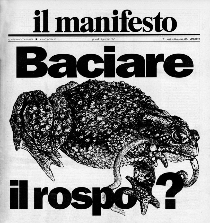 Era il lontano 1995 infatti quando il quotidiano “il manifesto” uscì con la prima pagina occupata dal disegno dell’animaletto in questione e la fatidica domanda: “Baciare il rospo?”. Il rospo era Lamberto Dini, ex ministro del primo governo Berlusconi il quale, dopo che il governo era stato travolto dalle proteste sociali e gli alleati della Lega (allora) Nord avevano staccato la spina per evitare di essere a loro volta asfaltati, aveva ricevuto l’incarico di formare un nuovo governo.