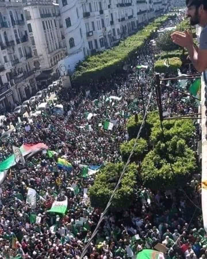 Sulla via Asselah Hocine, uno tsunami di persone: marea canta La Casbah-Bab El Oued … La canzone “Ahna ouled Amirouche, backtrack ma n’ouellouche, djaybine el houriya” incendia il viale. Una fanfara si esibisce in Min Djibalina [gloria alla lotta per l’indipendenza] e Qassaman, accompagnato da un coro folk improvvisato. Leggi al volo un cartello: “Sbab adhabna sarqou bledna” (La causa del nostro dolore: hanno rubato la nostra patria). Una donna che indossa un berretto verde manifesta con questa strofa presa in prestito da Ahlam Mosteghanemi [scrittore nato a Tunisi, molto letto nel mondo arabo]: “Non rubare la nostra parte di felicità. Solo uomini felici sono in grado di costruire una nazione.”
