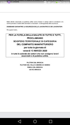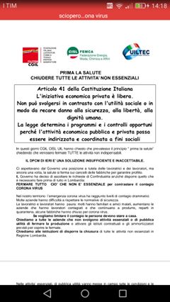 Ondata di scioperi Spontanei nelle fabbriche in Lombardia, ma anche i Piemonte Toscana Veneto, contro il decreto governativo che lascia libere le aziende di continuare la produzione. Scioperi spontanei anche a Brescia. Continua la produzione anche in aziende dove ci sono ammalati da coronavirus. Un atteggiamento criminale da parte di industriali che in azienda non hanno mascherine, nè possibilità di produrre a distanza. Piena solidarietà ai lavoratori che perdono il salario per poter proteggere la loro salute e fermare il contagio anche per noi.