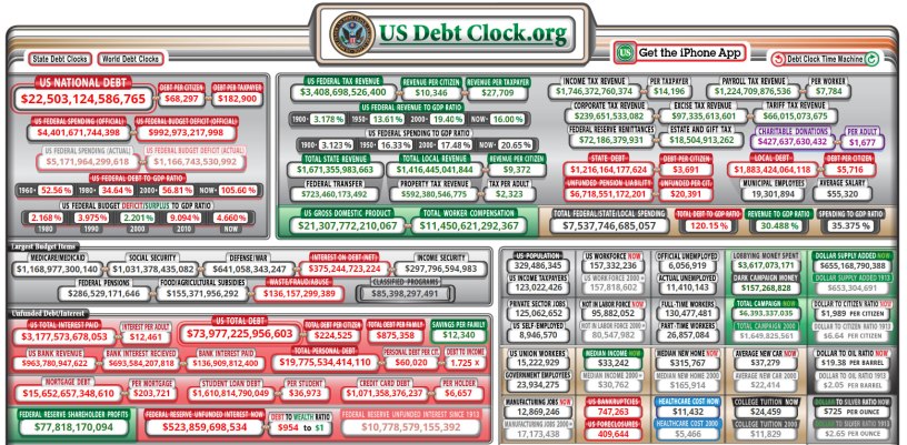 Nella crisi attuale si frantumano tutti i record. In particolare negli USA il debito pubblico ha sfondato ieri i 25.000 miliardi di dollari e continua una crescita impressionante. Un milione di dollari ogni 22 secondi. Contemporaneamente il Prodotto Interno Lordo nonostante le impressionanti elargizioni della FED è calato a poco più di 21.000 miliardi di dollari, e cala di un milione ogni 20 secondi. Così il debito pubblico ufficiale è schizzato al 118% del PIL.