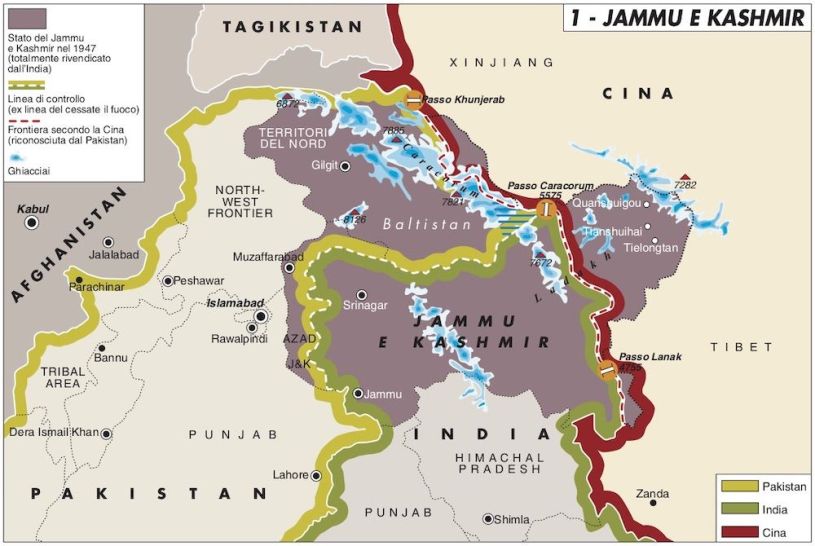 In questa situazione, sia Pechino sia New Delhi potrebbero essere tentate di cercare colpi di teatro che distraggano l’opinione pubblica e, meglio, facciano stringere i cittadini intorno al loro governo, una reazione naturale di fronte a un minaccioso nemico straniero. Nell’immediato è difficile anche capire come possano gestire la cosiddetta “de-escalation” che entrambi dicono di volere. Tutta l’intricata vicenda dei confini tra Cina e India, alle quali dobbiamo aggiungere il Pakistan, nasce e ruota intorno al destino dell’ex-principato del Jammu e Kashmir.