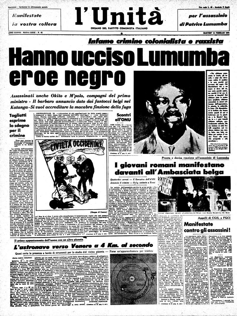 Il commissario di polizia belga Gérard Soete chiede gli conservino alcuni denti e una falange. Come di una bestia abbattuta, un feroce souvenir coloniale. I katanghesi per settimane mantengono il silenzio, replicano alle richieste dell’Onu assicurando che Lumumba sta bene. Poi imbastiranno una storia banale: un tentativo di evasione finito male, lo hanno ammazzato, dicono, imbestialiti, gli abitanti di un villaggio senza nome nella foresta. Munongo ironizza: “Mentirei se dicessi che la morte di Lumumba mi rattrista, era un criminale… dite che noi l’abbiamo assassinato. Rispondo: provatelo’’.
