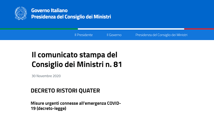 A queste misure si sono aggiunte quelle del Decreto Ristoro ter (vale 2 miliardi): un aumento di un miliardo e mezzo per rifinanziare i contributi a fondo perduto per le imprese e partite IVA che si trovano in regioni che passano dalla zona arancione a quella rossa o da quella gialla a quella arancione. Nel decreto ter c’è anche un modesto incremento 400 milioni per gli aiuti alimentari dei comuni. Infine il Ristoro quater (vale circa 8 miliardi), prevede una serie di rinvii delle scadenze fiscali per le imprese; alcune di loro potranno spostare al 30 aprile 2021 il pagamento delle tasse se hanno avuto una riduzione del fatturato del 33% (costa allo stato 4,8 miliardi); ci sono poi ristori a fondo perduto per nuove categorie come gli agenti di commercio ed anche aiuti una tantum per i lavoratori stagionali del turismo, delle terme, dello spettacolo e gli impiegati nello sport; infine c’è il sostegno al settore fieristico e nuovi fondi per la polizia.3