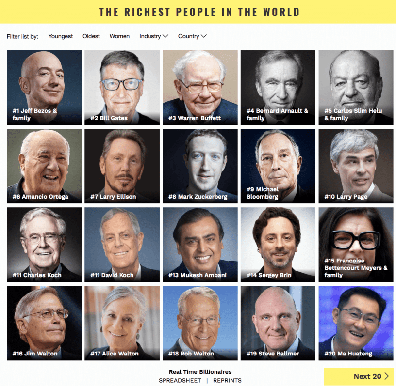 Forbes, in particolare, aggiorna in tempo reale (ogni 5 minuti) i patrimoni dei miliardari osservati e ne stima quotidianamente gli aumenti e le perdite di valore sulla base degli andamenti azionari. Così scopriamo che ci sono persone che (in genere senza fare niente) vedono il loro patrimonio aumentare di cifre a volte anche miliardarie in sole 24 ore.