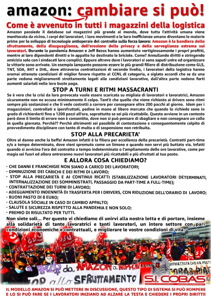 Mentre il fatturato di Amazon in Italia nel pieno della pandemia è aumentato del 30%, il livello di sfruttamento dei lavoratori e le condizioni generali di lavoro sono peggiorate. Le richieste sindacali di riduzione dei carichi e dell’orario di lavoro, dell’inserimento della clausola sociale per garantire continuità occupazionale, della stabilizzazione dei tempi determinati e dei lavoratori interinali e del rispetto delle norme su salute e sicurezza sono completamente ignorate, mentre le associazioni padronali rincarano la dose ponendo sul tavolo del rinnovo del CCNL della logistica richieste irricevibili come l’aumento dell’orario di lavoro fino a 44 ore per 6 giorni settimana, 26 domeniche lavorative, festività lavorative obbligatorie, la cancellazione dei primi 3 giorni di malattia, il controllo dei lavoratori con GPS e telecamere, l’aumento dei contratti precari e la limitazione del diritto di sciopero.