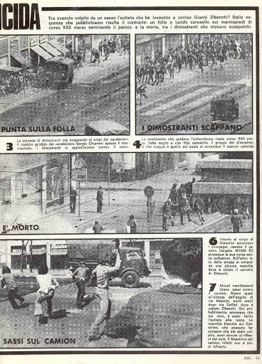 Noi, insieme al grosso della manifestazione, insistiamo a spingere verso la sede missina che finalmente viene espugnata e data alle fiamme. Nelle strade circostanti via Mancini (Corso 22 marzo, piazza Cinque giornate…) si scatena l’inferno. Un reparto dei carabinieri, lanciando a tutta velocità le autoblindo e i camion lungo le vie e perfino sui marciapiedi, cerca di disperdere i manifestanti. I feriti e i contusi si contano a decine. Ma un altro giovane, il ventisettenne Gianni Zibecchi, militante dei Comitati antifascisti, viene investito da un autocarro lanciato a tutta velocità sul marciapiede gremito di manifestanti. Gianni Zibecchi muore sul colpo, con il cranio schiacciato.