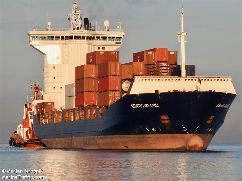 La «Asiatic Island» batte bandiera di Singapore, 150 m di lunghezza per 1.147 TEU di capacità. Si