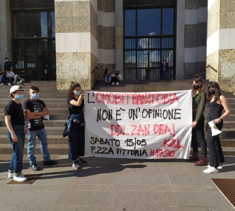 la manifestazione l’abbiamo organizzata come Kollettivo studenti in lotta, per sostenere l’approvazione rapida del DDL Zan, contro l’intolleranza e l’omofobia soprattutto nelle scuole e tra gli studenti.