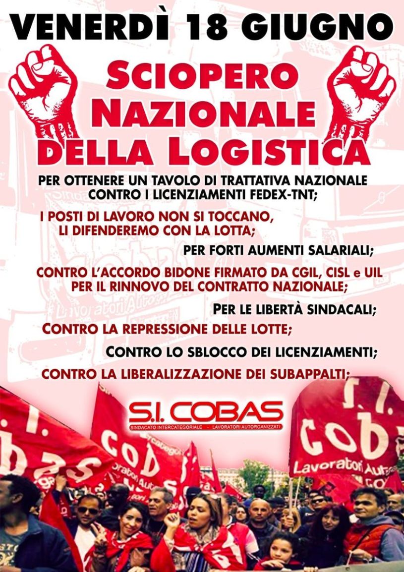 FOR THESE REASONS ON NEXT 18 JUNE THE SI COBAS HAS LAUNCHED A NATIONAL STRIKE IN THE WHOLE FREIGHT TRANSPORT AND LOGISTICS SECTOR.