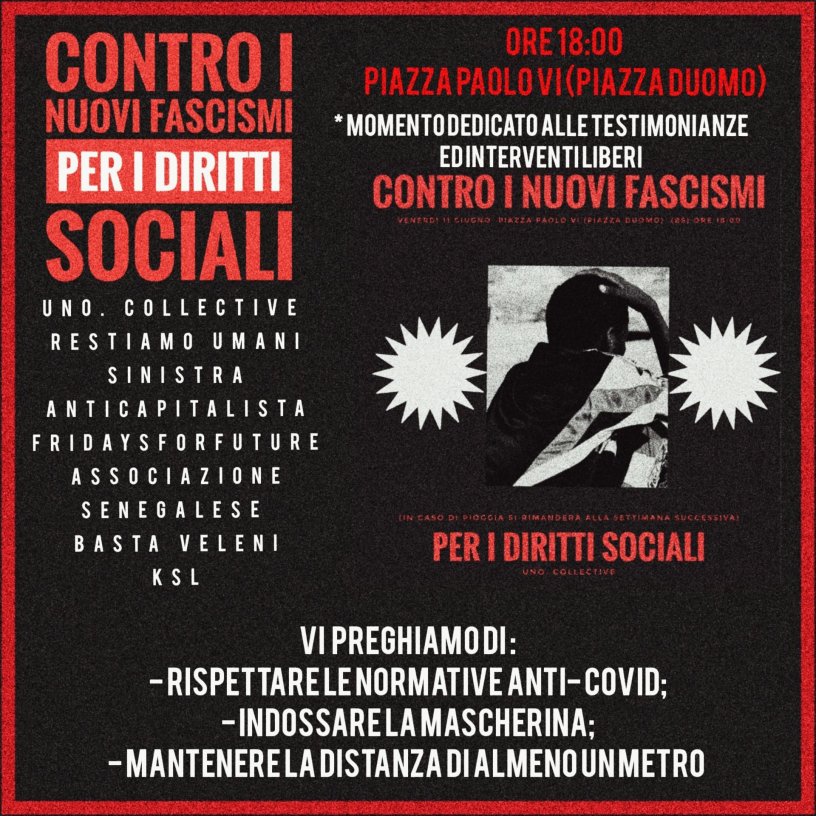 Oggi pomeriggio (venerdì 11) a partire dalle 18, sfidando le nuvole nere minaccianti un temporale, una settantina di persone, in gran maggioranza giovani, ha dato vita ad un presidio di protesta, davanti alla Prefettura. Il Collettivo UNO, gruppo di giovani che da oltre un anno sta organizzando iniziative antirazziste, prendendo spunto dagli ultimi tristi episodi di cronaca (i suicidi di due “neri”, uno senegalese, rinchiuso in un CPR, e l’altro italiano, che ha parlato nella sua ultima lettera del clima avvelenato intorno a lui) ha voluto denunciare i “nuovi fascismi”, che sembrano prendere sempre più piede nella società italiana. Per Francesca, che ha introdotto il “microfono aperto” in Piazza Duomo, non c’è altro modo di definire un’estrema destra razzista, misogina, omofobica, anti-ambientalista e antiproletaria. E il Collettivo (che si firma anche “Uno Collective”) ha chiamato altre realtà “di movimento”, come Restiamo Umani (ugualmente impegnata sul terreno antirazzista), Fridays For Future e Basta Veleni (entrambi impegnati sul terreno della difesa dell’ambiente), l’Associazione Senegalese, il KSL, oltre a Sinistra Anticapitalista, a partecipare ed intervenire su tutti questi terreni. Infatti i numerosi interventi (una dozzina) hanno spaziato dall’antirazzismo, appunto, all’ambientalismo, ai diritti LGBTQI, all’anticapitalismo a 360 gradi. Beppe, di Sinistra Anticapitalista, ha voluto ricordare il gravissimo episodio della scorsa notte alla Fedex vicino a Tavazzano (Lodi), dove un lavoratore immigrato, impegnato nel picchetto del SICOBAS, è stato ridotto in fin di vita da un’aggressione premeditata di “sbirri” privati, prezzolati dal padrone. Una “perfetta sintesi” di razzismo antiproletario. Alla fine sono state lette alcune frasi scritte da giovani immigrati e si sono osservati due minuti di silenzio, uno per ciascuno dei due ragazzi suicidatisi nei giorni scorsi. Poi un gruppo di ragazzi senegalesi ha dato vita ad un concerto improvvisato (percussioni e voci), spingendo a ballare la quarantina di persone che erano rimaste in piazza dopo le 20, e coinvolgendo anche qualche passante con i ritmi africani.