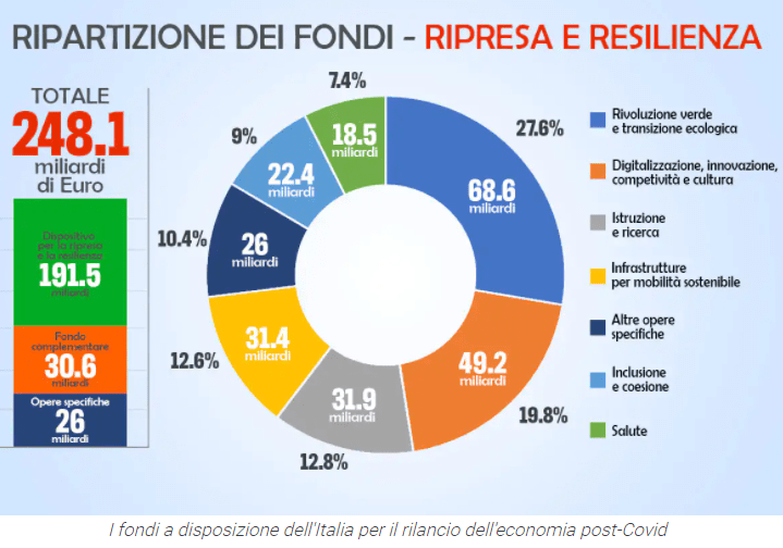 Il primo paragrafo del PNRR recita così: «La pandemia da Covid-19 ha colpito l’economia italiana più di altri Paesi europei. Nel 2020, il prodotto interno lordo si è ridotto dell’8,9 %, a fronte di un calo nell’Unione Europea del 6,2. L’Italia è stata colpita prima e più duramente dalla crisi sanitaria. Le prime chiusure locali sono state disposte a febbraio 2020, e a marzo l’Italia è stata il primo Paese dell’UE a dover imporre un lockdown generalizzato. Ad oggi risultano registrati quasi 120.000 decessi dovuti al Covid-19, che rendono l’Italia il Paese che ha subito la maggior perdita di vite nell’UE».