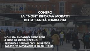 Anche a Brescia presidio davanti agli Spedali Civili di Brescia a sostegno del servizio sanitario pubblico contro la riforma Moratti. L’appuntamento, lanciato dalla Campagna Dico32 e dalla rete Non Sta Andando Tutto Bene, è fissato per sabato 20 novembre 2021 ore 10.30 alla fermata metro davanti agli Spedali Civili.