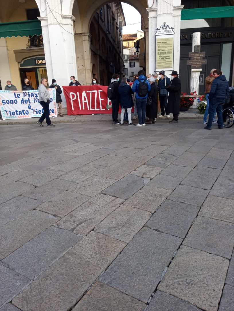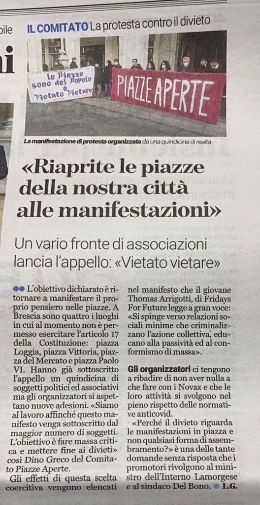 Ieri pomeriggio il coordinamento “Piazze Aperte”, nato in risposta sia all’ordinanza antidemocratica di Prefetto, Questore e Sindaco (avanguardie nella proibizione di manifestare nelle piazze centrali di Brescia), sia alla stretta autoritaria di Lamorgese-Draghi destinata a ridurre (con la scusa dei NO Vax) gli spazi democratici, ha svolto una partecipata conferenza stampa e flash mob davanti alla stele ai caduti di Piazza Loggia, luogo simbolo dell’antifascismo bresciano da quel maledetto 28 maggio 1974. Presenti una quarantina di militanti, appartenenti a movimenti, comitati, partiti (tra i quali il PRC, il PCI, Sinistra Anticapitalista), sindacati, associazioni) che hanno illustrato alla stampa locale le motivazioni della protesta. Dietro gli striscioni un giovane militante di Fridays for Future, Thomas Arrigotti, ha letto al megafono il “manifesto” di Piazze Aperte, in cui si critica duramente l’atteggiamento anti-democratico delle “autorità” locali e del governo Draghi, invitando i lavoratori ed i cittadini in genere a mobilitarsi contro gli assurdi divieti. Da sottolineare l’inspiegabile aggressività e nervosismo di alcuni esponenti delle cosiddette “forze dell’ordine”, che, con fare piuttosto minaccioso, se la prendevano con un compagno “reo” di portare un sacchetto di plastica con all’interno lo striscione “Le Piazze sono del Popolo. Vietato vietare”. Probabilmente non era il riferimento alla Sorbona del maggio ’68 a turbare alcuni poliziotti (dubitiamo che abbiano una seppur minima conoscenza degli slogan – e della stessa esistenza – del joli mai di 53 anni fa), ma la presenza, dentro Palazzo Loggia, dell’ineffabile ministra Gelmini (sì, la ricordate? La nota “intellettuale” berlusconiana!). Per fortuna le tensioni si sono stemperate e non sono sfociate in aggressioni fisiche, ma resta la sensazione di essere in presenza di un atteggiamento esageratamente “securitario” e “nervosetto” (per usare un eufemismo). Se una conferenza stampa e un flash mob di poche decine di persone fa saltare i nervi ad alcuni solerti difensori dell’ordine, immaginiamo le tensioni che accompagneranno la prevista mobilitazione di massa contro questi diktat antidemocratici.