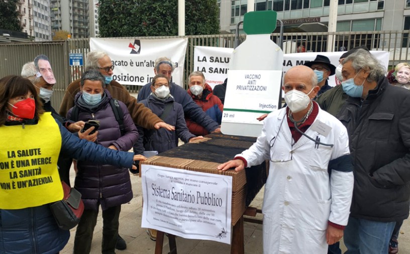 Nel corso del flash mob è stato sottolineato anche che le discussioni e i contrasti nella maggioranza di centrodestra, emerse in questi giorni, non hanno niente a che fare con eventuali ripensamenti sull’ulteriore spinta alle privatizzazioni! “In gioco c’è la torta dei finanziamenti europei e sta scoppiando una guerra tra bande su chi dovrà gestirla – ha detto Angelo Barbato del Forum Nazionale per il Diritto alla Salute- e infatti un emendamento di Forza Italia vuole sottrarre all’Agenzia Regionale per l’Innovazione e gli Acquisti (creatura della Lega e di Fontana) il controllo del malloppo e affidarlo all’assessorato della Moratti. Nei territori sta crescendo il malumore degli amministratori locali, anche di destra, a cui è stato sottratto il potere di intervenire sulla realizzazione delle Case della Comunità e dei servizi territoriali, già decisa dalla Regione con le localizzazioni identificate senza alcuna consultazione dei comuni e tanto meno della cittadinanza!” Per venerdì 26 novembre, alle 16 e 30, annunciata una manifestazione regionale in previsione del voto finale sulla legge. Di nuovo sotto il vecchio Pirellone.