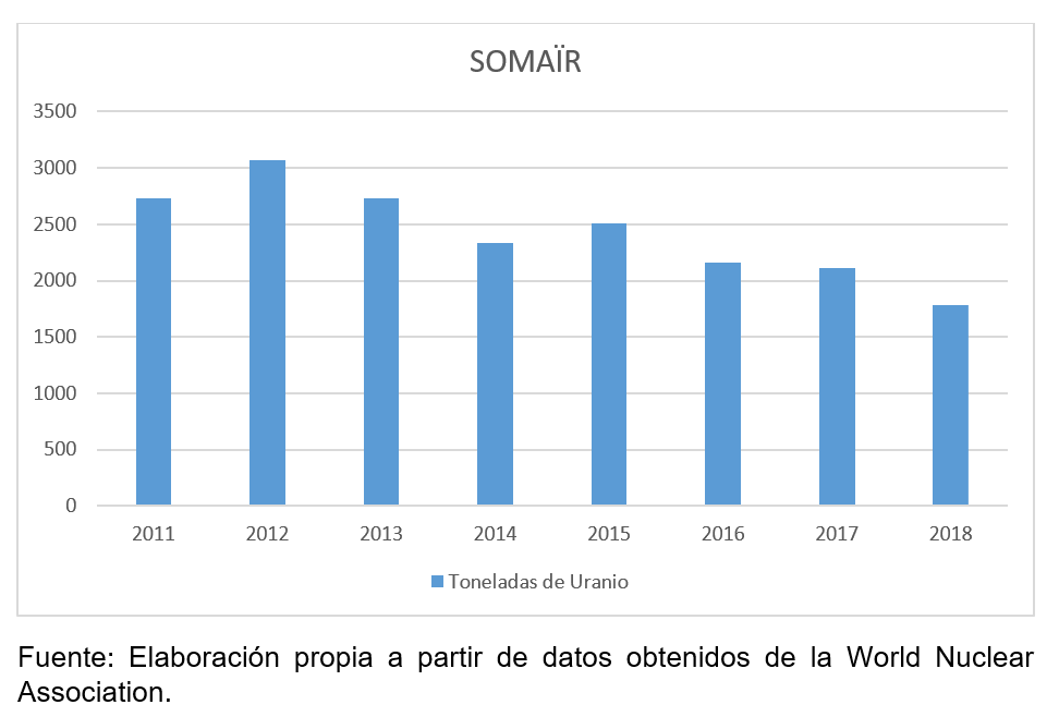 La produzione totale del paese era stata di circa 150 000 tU fino alla fine del 2019. Secondo la Word Nuclear Association [WNA in seguito], nel 2018 l’Agenzia internazionale dell’energia atomica (AIEA) ha stimato le risorse ragionevolmente assicurate (RAR) del Niger a 237 000 tU al costo di produzione sotto i 130 $/kgU, per lo più accessibili a cielo aperto. Nel frattempo, le risorse date in concessione erano 42.500 tU al costo di produzione sotto i $130/kg, tutte in arenaria e quasi tutte accessibili a cielo aperto.