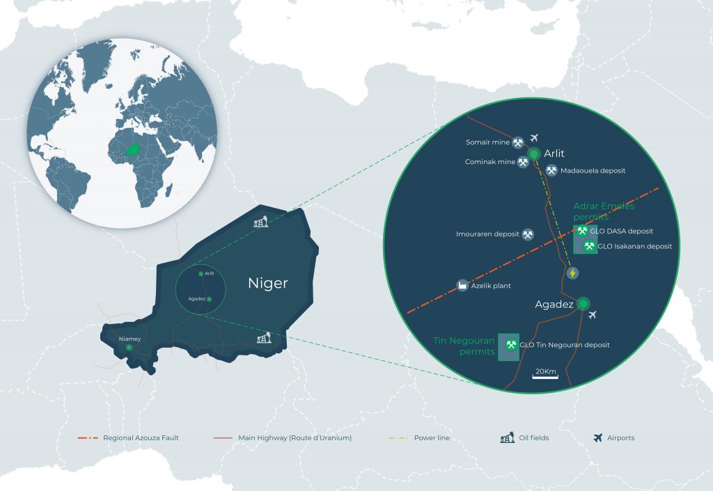 - Dasa: Global Atomic Corporation, una società quotata alla Borsa di Toronto, sta sviluppando il progetto Dasa che fa parte dello sviluppo di Adrar Emoles nel bacino di Tim-Mersoi, a metà strada tra Arlit e Agadez e a sud delle miniere di uranio SOMAÏR e COMINAK a Orano.