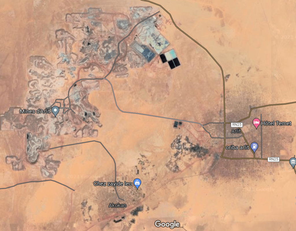 Lo sfruttamento commerciale di questo minerale è iniziato nel 1971 dalla Société des Mines de l’Aïr (SOMAÏR) e dal 1978 dalla Compagnie Minière de l’Akokan (COMINAK) [chiuso], entrambe filiali della ex Areva (ora Orano), cioè dai francesi. Secondo la WNA, la produzione di SOMAÏR e COMINAK rappresentava circa il 5% della produzione mondiale di uranio.