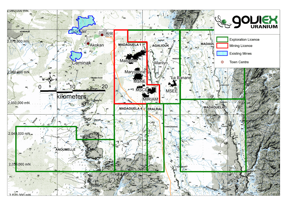- Madaouela: Il progetto Madaouela di GoviEx Uranium (Canada) si trova a 15 chilometri dalle miniere di Arlit e Akouta (SOMAIR e COMINAK) nella regione di Arlit del Massiccio dell’Aïr ed è stato scoperto dalla CEA (Commissione francese per le energie alternative e l’energia atomica).