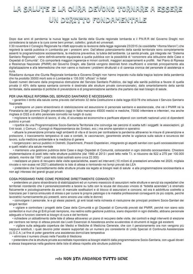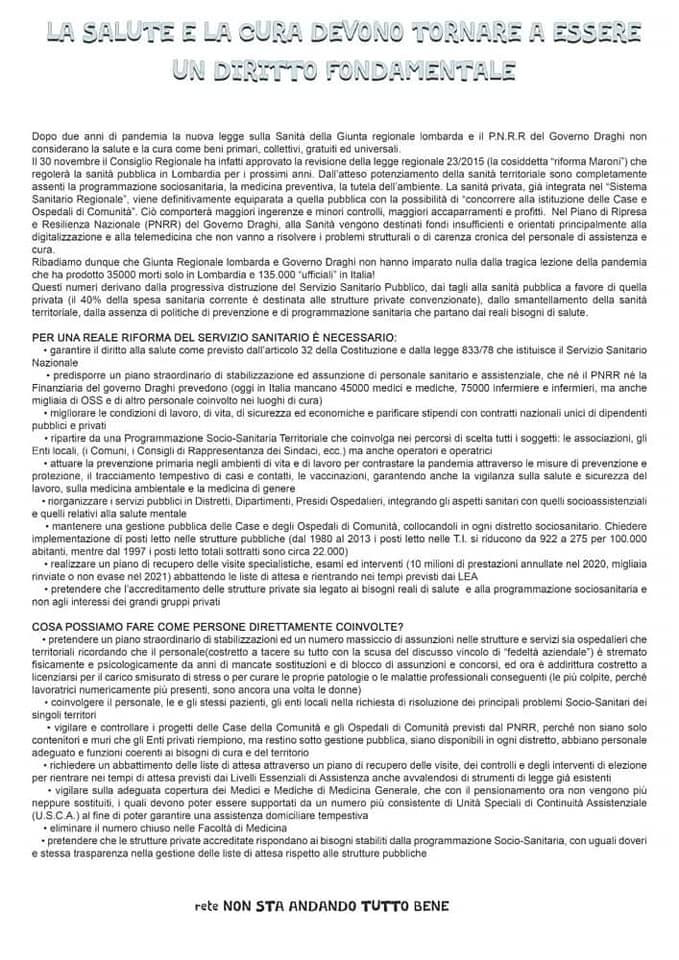 Dopo due anni di pandemia la nuova legge sulla Sanità della Giunta regionale lombarda e il P.N.R.R del Governo Draghi non considerano la salute e la cura come beni primari, collettivi, gratuiti ed universali.