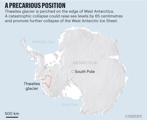 Per il mantenimento dello status quo naturale, Thwaites ha un potenziale impatto così importante come forza negativa che un team di scienziati sta effettuando uno studio del ghiacciaio intitolato: The International Thwaites Glacier Collaboration (La collaborazione internazionale del ghiacciaio Thwaites). Il glaciologo a capo del team, Ted Scambos (Università del Colorado a Boulder), ha affermato via Zoom dal Thwaites che “La situazione sta evolvendo davvero rapidamente qui…. è preoccupante”.