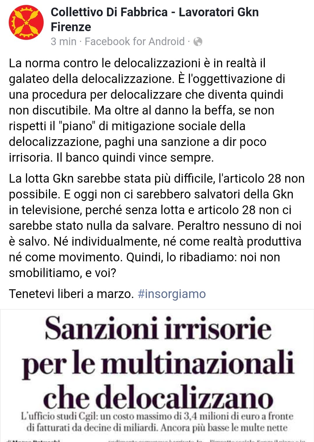 Danilo Conte dei Giuristi Democratici aggiunge: “il disegno di legge presentato questa mattina al senato suscita molte perplessità ed anche un certo stupore. Che su questo tema dopo tutti questi mesi di dibattito anche normativo, dopo un emendamento assolutamente inefficace presentato dal governo ed approvato, dopo il deposito di un disegno di legge elaborato dal collettivo di fabbrica, la politica elabori una proposta di legge così povera di contenuti e così intrinsecamente inutile, è un segno ulteriore della distanza tra il palazzo ed il paese reale. La domanda che sorge subito dopo aver letto la proposta di legge è: se questo testo fosse vigente il fondo Melrose avrebbe potuto intimare comunque i licenziamenti? La risposta è sì. La politica rinuncia ad un vero governo dell’economia ed accetta un ruolo secondario e gregario. Siamo ancora al livello di premi ed incentivi per chi, bontà sua, non sposta la produzione all’estero. O al massimo (come nel caso dell’emendamento governativo) alla previsione di una ininfluente sanzione economica. Vi sono poi altre perplessità anche più tecniche, la definizione molto restrittiva di delocalizzazione che la proposta prevede all’art. 1, l’assenza di qualsiasi ruolo di monitoraggio da parte dello stato sull’utilizzo degli incentivi di imposta. Riteniamo che se la politica intende affrontare seriamente il tema non può sottrarsi da un serio confronto con la proposta di legge del collettivo GKN.”