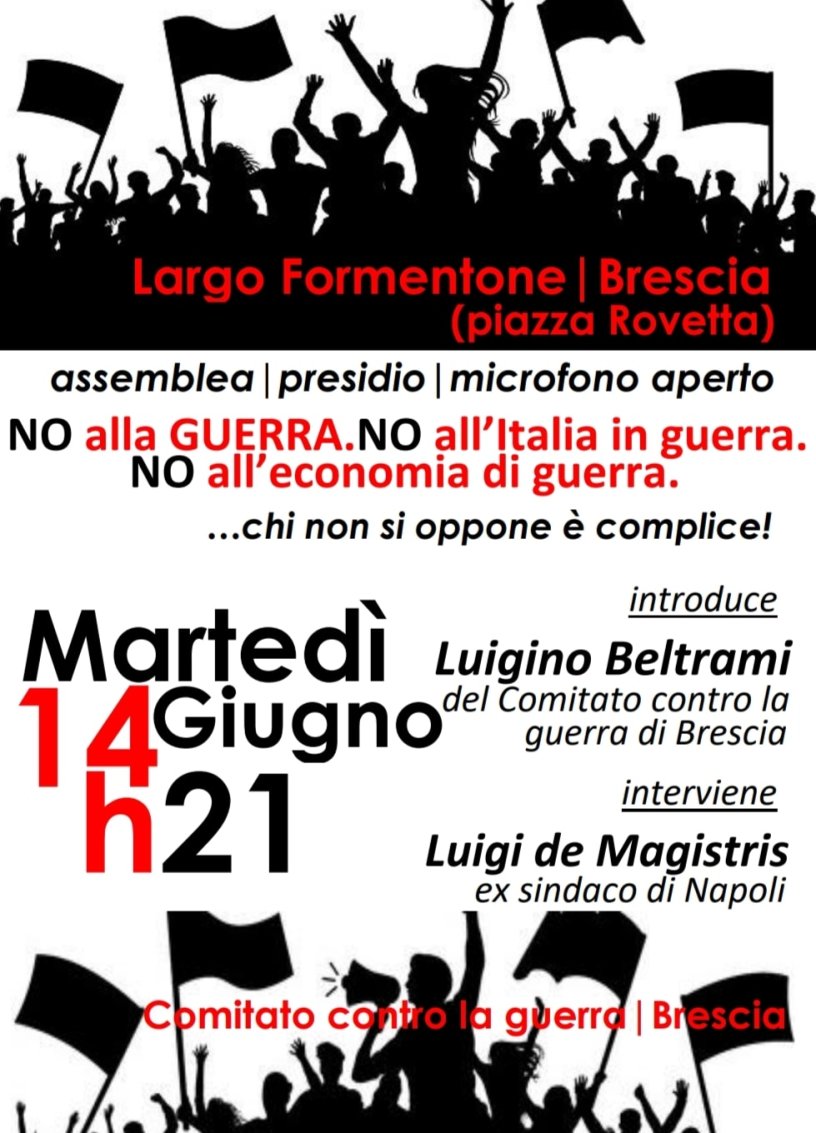 Martedì prossimo, 14 giugno, il Comitato Bresciano Contro La Guerra (la struttura unitaria che riunisce quasi tutta la sinistra cosiddetta “radicale”, organizzata o meno, contro la guerra) rilancia l’iniziativa contro la guerra tra Russia e Ucraina (e contro tutte le guerre in generale). Dopo la riuscita iniziativa della sera del 24 febbraio in Piazza Duomo (oltre 800 presenti) e le varie scadenze di questi oltre 100 giorni di massacro (tra cui quella alla base di Ghedi), il Comitato approfitterà della presenza dell’ex sindaco di Napoli, Luigi De Magistris, per discutere sulle prospettive del movimento anti-guerra a Brescia, in Italia e nel mondo. Introdurrà il compagno Luigino Beltrami, conosciuto e apprezzato da tutte le varie “anime” della sinistra bresciana, e noto per il suo costante, pluridecennale impegno anti-militarista. Seguirà poi l’intervento di De Magistris e di tutti coloro che vorranno dire la loro. Contro la guerra, contro TUTTI gli imperialismi, per la solidarietà tra tutti gli oppressi: nostra patria è il mondo intero!