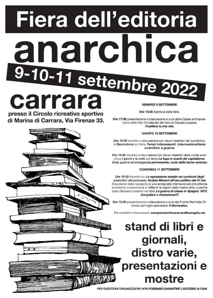 Programma della fiera dell’editoria anarchica che si terrà a Marina di Carrara dal 9 all’11 settembre 2022 presso il Circolo ricreativo sportivo, via Firenze 33: