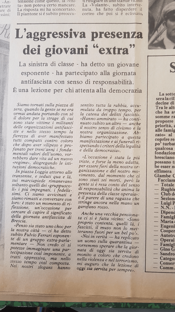 - Lotta Comunista. I Gruppi Leninisti della Sinistra Comunista (nome ufficiale dell’organizzazione fondata da Cervetto e Parodi nel 1965) nascono a Brescia agli inizi del 1971, creando “Comitati Leninisti” nelle scuole superiori (Liceo Arnaldo, ITIS, ITC ABBA) e gruppi operai alla Pietra, Sant’Eustacchio, Metalars, ecc. Non moltissimi i militanti (Omodeo, Eliana Zanini, Odorici, Facchini, Lisitano, ecc.) che trovano una sede prima in Contrada Santa Croce e successivamente in Via Corsica. Piuttosto isolati rispetto agli altri gruppi, vengono spesso attaccati (a volte fisicamente) dai gruppi maoisti (in particolare dal MS-MLS) che li definiscono “para-fascisti”, durante le manifestazioni studentesche. In lenta crescita fino al 1975/76, subiscono anch’essi la crisi di militanza coincidente con il “movimento del ’77”, riuscendo faticosamente a ricostruirsi (anche tramite i loro “Circoli Operai”) a partire dalla fine del decennio, inizio degli anni ’80.