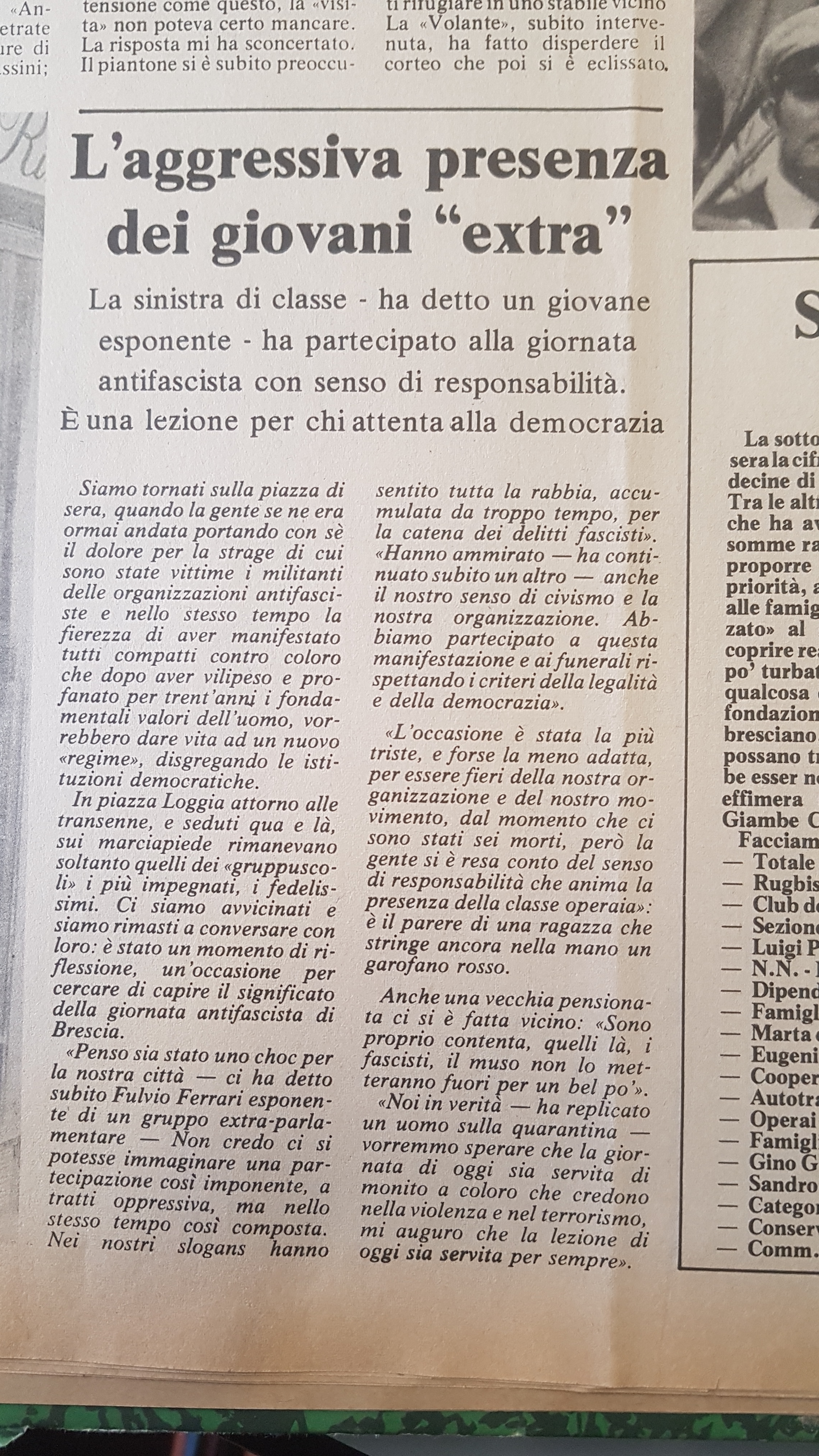- Avanguardia Operaia. Anche AO, come LC, deve la sua nascita all’influenza di militanti esterni (come la clarense Claudia Sorlini, o Alberto Garlandin, tra i dirigenti del gruppo milanese di AO), verso la fine del 1970, inizi 1971. Con una sede in Via Capriolo, 35, i pochi militanti di AO (Garbarino, Orazio Longo, Maria Longo, Pedizzi, ecc.) vengono stigmatizzati come “professorini” dai militanti di LC, sia per la loro professione (studenti universitari e insegnanti, come Giulietta Banzi o Luigi Pinto, due delle vittime della strage di Piazza Loggia) sia per il conclamato interesse per la teoria marxista. Definiti “trotskisti” dai maoisti (che spesso aggrediscono i militanti di AO durante le manifestazioni, pur senza arrivare agli estremi “milanesi”) essi rifiutano questa etichetta, preferendo la definizione di “leninisti”. La lenta crescita di AO a Brescia, paragonata a quella impetuosa di LC, avviene soprattutto nelle scuole medie superiori (in particolare nei licei e all’ITIS), dove vengono creati i Comitati d’Agitazione. Nonostante una limitata presenza in alcune fabbriche (Idra, OM) AO, nonostante il nome, resterà probabilmente l’organizzazione meno “operaia” dell’estrema sinistra bresciana. La crescita (relativa rispetto agli altri gruppi) costringe al trasloco nella nuova sede di via Calatafimi 12. Al momento della strage del 28 maggio 1974, che si porterà via due compagni, il gruppo conta con 16 militanti e una ventina di simpatizzanti, raddoppiatisi entro la fine del 1975. Fuori dalla città AO può contare con un piccolo gruppo di militanti a Chiari. Superata la linea astensionista, con l’esperienza della prima coalizione di Democrazia Proletaria alle regionali del ’75 (AO + PdUP, che in provincia di Brescia ottiene 12 mila voti, pari all’1,9%) inizia anche da noi il percorso di avvicinamento al PdUP, che porterà prima alla nuova coalizione di DP alle politiche del ’76 (coalizione allargata a LC, MLS, ecc., ma che vedrà gli stessi risultati dell’anno precedente nella nostra provincia) e poi all’adesione (in provincia di Brescia pressoché unanime) al progetto di Democrazia Proletaria come partito, a partire dal 1978.