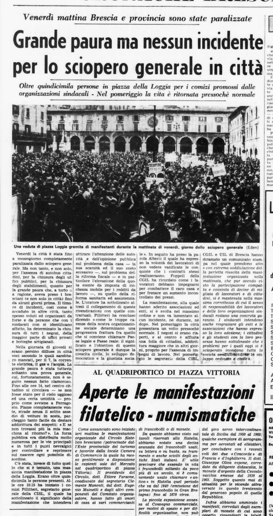 | 19/11/1969 | Nuovo sciopero generale con manifestazioni in molti centri della provincia. In città manifestazione dei “maoisti” (definizione del GdB) in Piazza Loggia. |