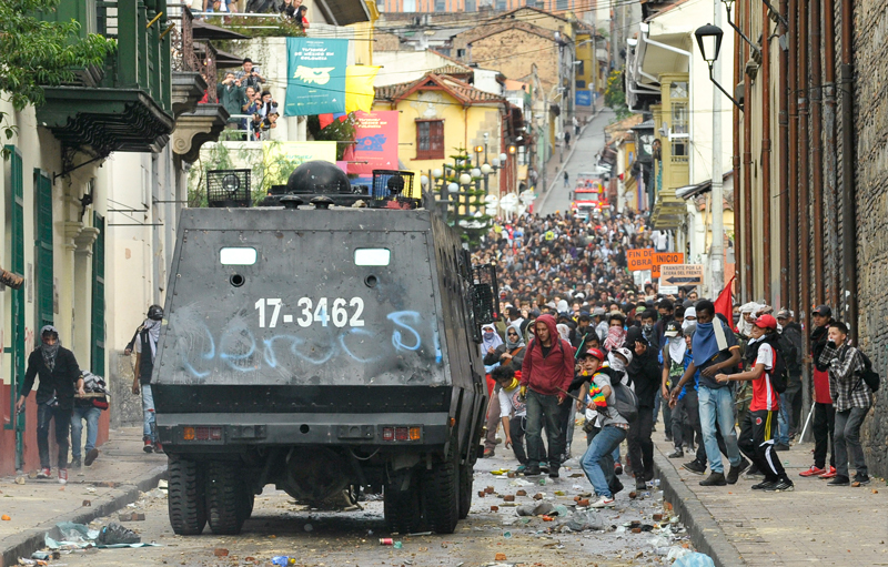 Tra i più impegnati nelle contestazioni gli studenti dell’Universidad Javeriana che si sono distinti sia nel presidiare, bloccando il traffico, diversi incroci stradali, sia nel confronto con i reparti dell’ESMAD (la polizia anti sommossa). Gli scontri più accesi si sono registrati all’angolo della Calle 72 e della Carrera 11. Qui alcuni manifestanti con il volto mascherato si sono impadroniti di un autobus usandolo come barricata e cercando di incendiarlo.