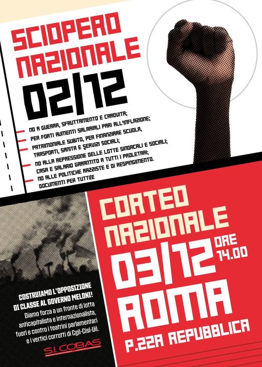 SI Cobas – Unione Sindacale di Base – Sindacato Generale di Base – Confederazione Unitaria di Base – Movimento di lotta disoccupati 7 novembre – Collettivo Autonomo Lavoratori Portuali – Movimento per il diritto all’abitare – Prendiamo Casa Cosenza – Genova City Strike – Perugia Solidale – Cambiare Rotta organizzazione giovanile comunista – Laboratorio politico Iskra – Osservatorio Repressione – Opposizione Studentesca d’Alternativa – Potere al Popolo – DemA – ManifestA – Partito della Rifondazione Comunista – Unione Popolare – Fronte della Gioventù Comunista – Rete dei Comunisti – Fronte Comunista – Tendenza Internazionalista Rivoluzionaria – PLAT Piattaforma di Intervento Sociale – Collettivo Militant – Casa del Popolo Teramo – Centro sociale Intifada – Dazebao Centocelle – Operatori Sociali Autorganizzati Perugia – Spazio Catai Padova – Centro Internazionale Crocevia – Centro sociale Nuvola Rossa (Rc) – Spazio Pueblo (Cava de Tirreni) – Collettivo No al Fossile Civitavecchia – Comitati contro il rigassificatore di Piombino – FIR La voce delle lotte- Medicina Democratica- Rete nazionale “Noi non paghiamo”- Sinistra Anticapitalista.
