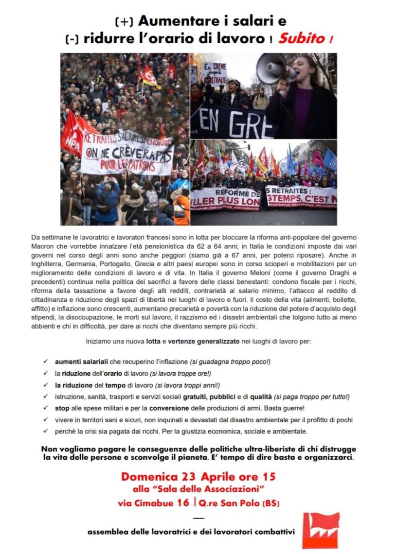 Domenica prossima, dopo quasi due anni di inattività, si cercherà di rimettere in moto (sull’onda della grande mobilitazione dei lavoratori francesi, e non solo) l’Assemblea dei lavoratori combattivi. L’appuntamento è per le ore 15 alla Casa delle Associazioni, a S. Polo. Ovviamente l’assemblea è aperta a tutt*, ma si punta soprattutto al coinvolgimento delle forze già organizzate del sindacalismo di classe bresciano (SICOBAS, USB, COBAS, CUB, SLAI-COBAS e Opposizione CGIL)