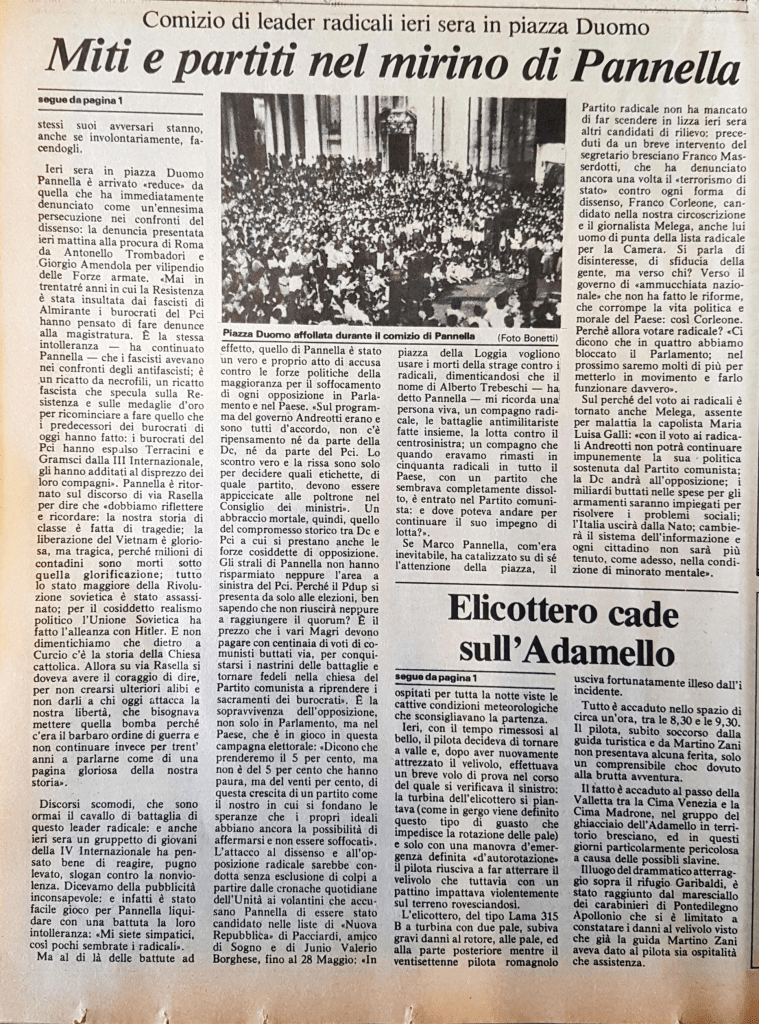 Un discorso a parte va fatto per una terza lista, quella del Partito Radicale. Un lettore del giorno d’oggi (ma già negli anni ’80 il problema si sarebbe riproposto) si stupirà di vedere accomunato il PR di Pannella con l’estrema sinistra. Un partito che è tornato, dopo la parentesi degli anni Settanta, alle sue radici liberali, che ci faceva con l’estrema sinistra? In realtà il flirt dei radicali con la “nuova sinistra” era iniziato già ai tempi della battaglia contro il referendum antidivorzista, nel 1974. Il giornale radicale, Liberazione, per fare un esempio, usciva come inserto del quotidiano Lotta Continua. E Marco Pannella, animale politico come pochi, seppe sfruttare appieno la “moda” gauchiste di quegli anni. Le sue critiche “da sinistra” a PCI e PSI sembravano riecheggiare, pur con molti distinguo, quelle dei “gruppi” extraparlamentari. E spesso, soprattutto nel caso delle battaglie sui diritti civili, i (pochi) militanti radicali si trovavano frammisti ai (molti) militanti dell’estrema sinistra. La dura battaglia contro la legge Reale e in genere contro le leggi repressive “anti-terrorismo” avvicinarono ancor più, nella seconda metà del decennio, i seguaci di Pannella e parte dei militanti “rivoluzionari”, in particolare gli ex Lotta Continua, sia quelli che si avvicinarono alle posizioni dell’Autonomia Operaia sia quelli che iniziarono allora l’evoluzione verso posizioni più moderate. A Brescia in particolare l’Associazione Radicale guidata dall’ex maoista Franco Masserdotti cercò, con discreto successo, di diventare punto di riferimento per quella parte di estrema sinistra che, dopo la crisi dei gruppi maoisti e di LC, si trovava priva di una struttura politico-organizzativa. L’operazione “masserdottiana” ebbe il suo clou, come dicevamo nell’articolo del 13 maggio, con il lancio del periodico “Spazio Altro” e di “Opposizione Radicale”. Probabilmente il buon Masserdotti si spinse un po’ troppo oltre, in questo corteggiamento filo-ultrasinistra, visto che una parte dei radicali decise, pochi mesi dopo le elezioni del ’79, di dar vita ad una nuova Associazione Radicale, più “classica” e liberal-democratica, la “Giorgiana Masi”, in aperta polemica con “l’estremismo” di Masserdotti e soci. Nella lista del PR per la Camera troviamo infatti, oltre al Masserdotti, a Ken Damy e all’ex PC(m-l)I Ettore Zucca (che ritoveremo alle comunali dell’80), l’ex dirigente della Lega Marxista Leninista Elidio De Paoli e Angelo Puerari, uno dei fondatori del “Comitato 7 aprile” di Brescia. Una menzione a parte va fatta per il candidato del PR al Senato, Pippo Apicella, avvocato molto famoso, ex esponente del PCI ma sempre piuttosto aperto all’interlocuzione con la nuova sinistra.