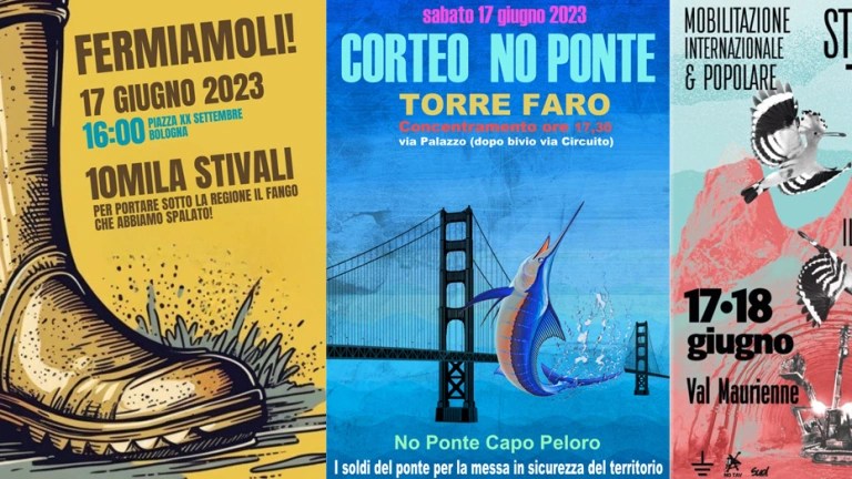 Sabato 17 giugno: tre manifestazioni contestano il Tav, il Ponte e il consumo di suolo che ha causato l’alluvione in Romagna. Questo articolo riassume le ragioni di tre campagne decisive ma vorrebbe enfatizzare il ruolo che dovrebbe avere l’istanza ecosocialista nei processi di convergenza e insorgenza [Checchino Antonini]