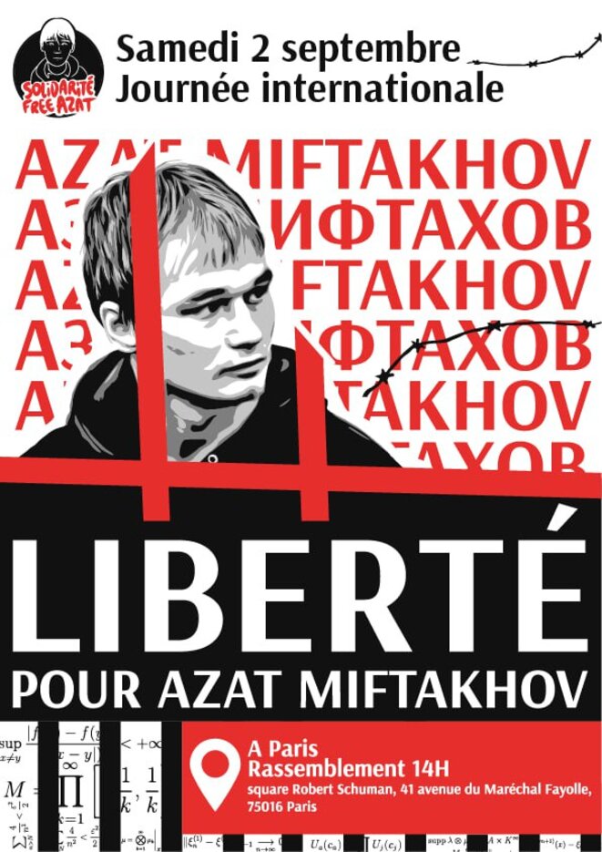 Il 2 settembre alle 14.00 si terrà una manifestazione a Parigi, non lontano dall’ambasciata russa, in Square Robert-Schuman (41 avenue du maréchal Fayolle), per chiedere la liberazione di Azat Miftakhov, matematico e attivista anarchico antifascista che sta trascorrendo il suo quinto anno di carcere in Russia.