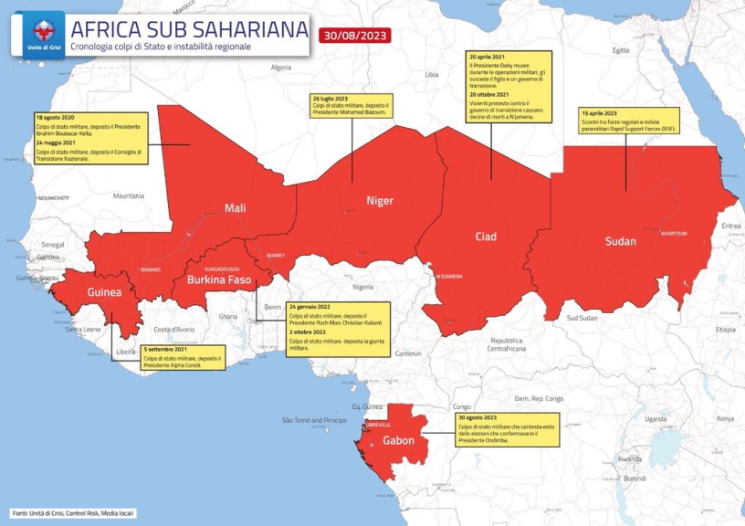 Partendo dal caso più recente, in Niger il presidente Mohamed Bazoum è stato rovesciato dai soldati spingendo l’Ecowas, comunità economica degli Stati dell’Africa Occidentale, a schierare una forza regionale per “ripristinare l’ordine costituzionale”. Il vicino Burkina Faso l’anno scorso ha vissuto due colpi di stato in otto mesi. Il 24 gennaio 2022 il presidente Roch Marc Christian Kaboré è stato spodestato dai militari. Al suo posto si è insediato il tenente colonnello Paul-Henri Sandaogo Damiba che a fine settembre però è stato “spodestato” da un altro colpo di stato militare. In Sudan, in preda a una guerra civile da alcuni mesi, i leader civili di transizione, che avrebbero dovuto guidare il Paese verso la democrazia dopo 30 anni di dittatura, sono stati estromessi il 25 ottobre 2021 dai militari. In Guinea il presidente Alpha Condé è stato rovesciato il 5 settembre 2021 da un colpo di stato militare con l’esercito che ha promesso di restituire il posto ai civili eletti entro la fine del 2024. In Mali il 18 agosto 2020 il presidente Ibrahim Boubacar Keïta è stato rovesciato dai militari, formando un governo di transizione. Poi il 24 maggio 2021, i militari hanno arrestato il presidente e il primo ministro, insediando il colonnello Assimi Goïta come presidente di transizione. La giunta si è impegnata a restituire il posto ai civili dopo le elezioni previste per febbraio 2024.