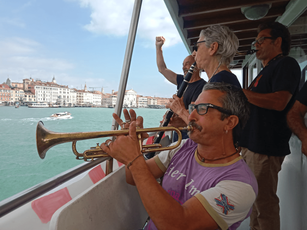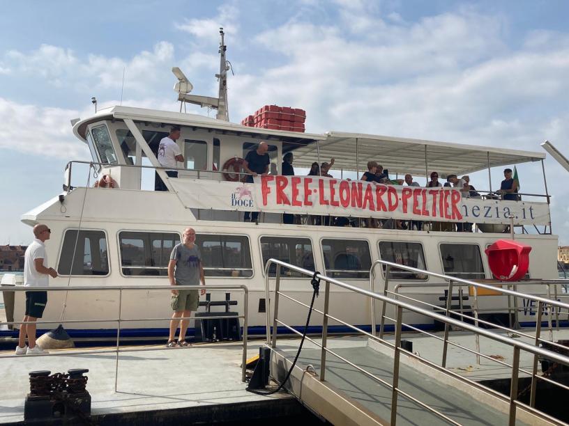Leonard Peltier, il “Mandela dei nativi nordamericani”, è stato al centro dell’attenzione di una quarantina di militanti (e di migliaia di turisti e di veneziani) in questo fine settimana. Grazie alla testarda coerenza di Andrea De Lotto, un compagno milanese che da 12 anni si batte per la sua liberazione, e alla presenza degli Ottoni a Scoppio (una band militante milanese che da molti anni rende i cortei e le manifestazioni meno noiosi e rituali), il piccolo gruppo di attivisti (tra i quali una piccola delegazione di 4 compagn* di Brescia Anticapitalista) ha cercato di far conoscere l’incredibile vicenda del militante Lakota dell’American Indian Movement, da 47 anni ingiustamente sepolto vivo dal regime USA, ai veneziani e ai turisti che affollavano le calle e i campi della Serenissima. Complice anche una motonave (che vedete nella foto) con striscione annesso che ha percorso il canale della Giudecca fino a sfiorare Piazza San Marco, per poi dirigersi verso Burano, Torcello e il MOSE al Cavallino. Nave con striscione e musica degli Ottoni non potevano passare inosservati, ovviamente. Sguardi sorpresi e stupiti, molte mani che si alzavano a salutare da barche e vaporetti, qualche (raro purtroppo) pugno chiuso ad incoraggiare questa singolare lotta quasi semi-secolare (e avvolta da un assordante silenzio mediatico, ovviamente). Una volta sbarcati, il gruppetto, poco numeroso ma molto rumoroso, ha percorso vari chilometri, tra musica, slogan e improvvisati comizi di Andrea al megafono, per rivendicare il diritto a muoversi liberamente per il pianeta PER TUTTI GLI ESSERI UMANI, sottolineando di fronte ai turisti che ci fotografavano come il loro sacrosanto diritto di movimento che li aveva portati a godere delle bellezze di Venezia non fosse ritenuto altrettanto sacrosanto dalle “autorità” italiane, europee, nordamericane, ecc. Autorità chiaramente responsabili della morte di migliaia di bambini, di donne e di uomini annegati nel Mare Nostrum (o morti di sete e fame nel deserto del Sahara o in quello al confine tra Messico e USA). Qualche tensione c’è stata con alcuni (per fortuna pochi) veneziani, in prevalenza bottegai, che non apprezzavano questo discorso di solidarietà internazionalista, simboleggiato dallo striscione di apertura del piccolo corteo, con la frase di Dante Alighieri “Io ho per patria il mondo come i pesci hanno il mare”