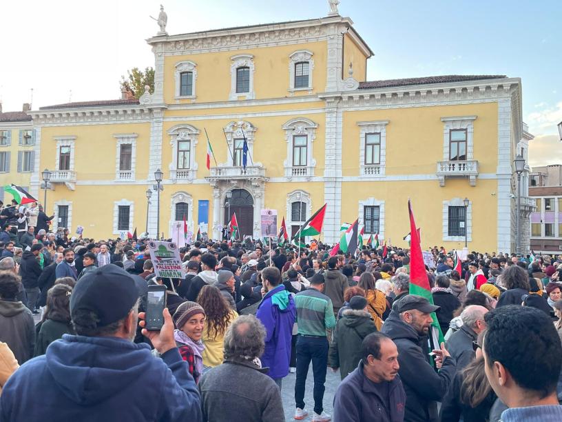 Nuova, riuscita manifestazione a Brescia, contro il massacro operato dalle forze sioniste in Palestina. Tra le 2 e le 3mila persone hanno manifestato nel centro della città, con un lungo e colorato corteo, iniziato in via S. Faustino e terminato in Piazza del Mercato, in una combattiva manifestazione, indetta dall’Associazione Italia-Palestina con l’adesione di moltissime altre realtà. Oltre ad un grande numero di immigrati (arabi, pakistani, nordafricani, ecc.) questa volta la presenza della sinistra bresciana è stata piuttosto visibile. Probabilmente la metà dei partecipanti era “autoctona” (se ha senso usare questa definizione, vista la grande partecipazione di giovani bresciani, di origine “migrante”, ma nati a Brescia). Le bandiere rosse (di Rifondazione Comunista, del PCI, dei CARC, di Sinistra Anticapitalista), viola (Unione Popolare) e arcobaleno, pur essendo comprensibilmente immerse in un mare di bandiere palestinesi, rendevano visibile agli occhi della gente che guardava il corteo la presenza di questa variegata sinistra. E persino una delle canzoni diffuse dal camion (“La Rossa Palestina”, creata dal Movimento Studentesco mezzo secolo fa) ricordava, a quelli come me, calvi o coi capelli grigi, le nostre manifestazioni anti-sioniste di 50 anni fa, quando nessuno parlava di “ebrei e musulmani”, ma di aggressori sionisti e palestinesi oppressi. Lo slogan più diffuso, Palestina Libera, permetteva a chiunque di riconoscervisi, dando l’interpretazione preferita all’aggettivo (che per me continua ad essere libera dal sionismo, da ogni integralismo religioso, laica e socialista). E anche “Israele fascista, stato terrorista” che, pur nella schematicità magari non perfettamente condivisibile della prima definizione, dà il senso dello schieramento dal lato “giusto” della Storia (cosa non scontata per le centinaia di giovanissime con l’hijab che lo lanciavano, e che permette un poco di ottimismo). In piena sintonia col resto del mondo (vedi anche la grandiosa manifestazione di un milione di persone – tra cui moltissimi ebrei – a Washington), anche a Brescia la mobilitazione continua a crescere, contro l’aggressione sionista e imperialista e contro un governo italiano guidato dagli ex-antisemiti riscopertisi filo-sionisti.