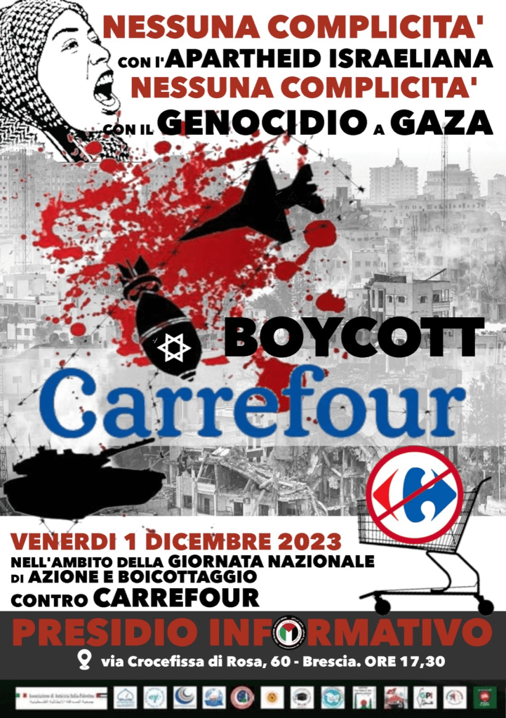 Da quasi due mesi Brescia antifascista ed antirazzista si sta mobilitando in solidarietà col popolo palestinese, con cortei e presidi a cui hanno partecipato migliaia di persone. Anche il rilancio della campagna BDS, per il boicottaggio dello stato sionista, fa parte di questa mobilitazione. Domani questa azione di boicottaggio sarà simboleggiata dal presidio davanti a Carrefour, in via Crocifissa di Rosa, 60, dalle ore 17.30 in poi. Brescia Anticapitalista parteciperà, come ha sempre fatto, a questa azione di solidarietà col popolo palestinese.