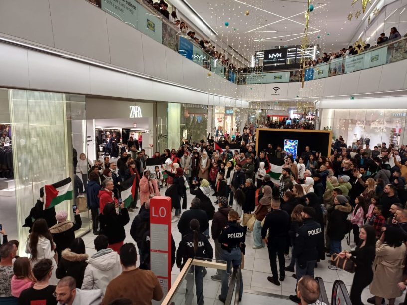 Passeggiata solidale con la Palestina dentro Elnòs, il più grande centro commerciale di Brescia.